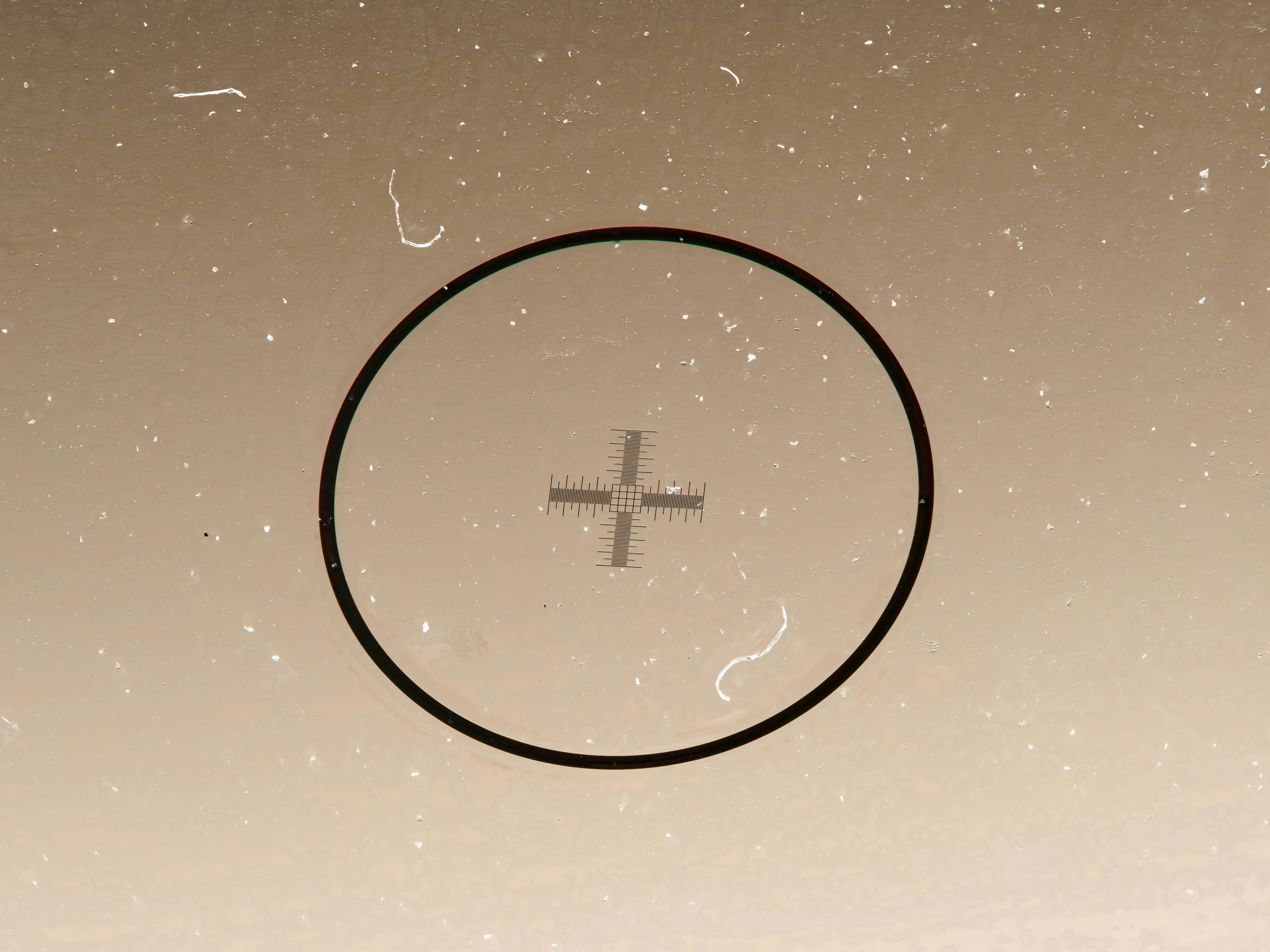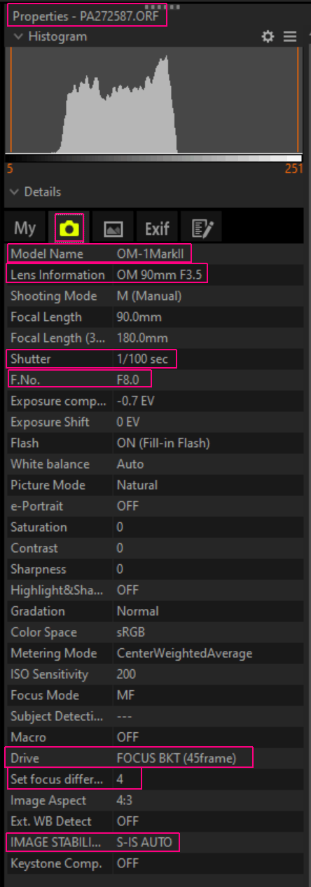 Voici une image en focus bracketing, avec la mire non perpendiculaire à l'axe optique. Toujours à f/8, 1/100s, 200 iso. Les paramètres du focus bracketing sont un différentiel de 4, et il y a 45 images dans le stack. Ces données se retrouvent facilement dans OM Workspace. Voici une des images du stack pour se rendre compte de la profondeur de champ sur une des images. J'ai utilisé un flash Godox V860IIIO et un diffuseur AK Diffuser. L'assemblage a été fait avec Zerene Stacker. Le